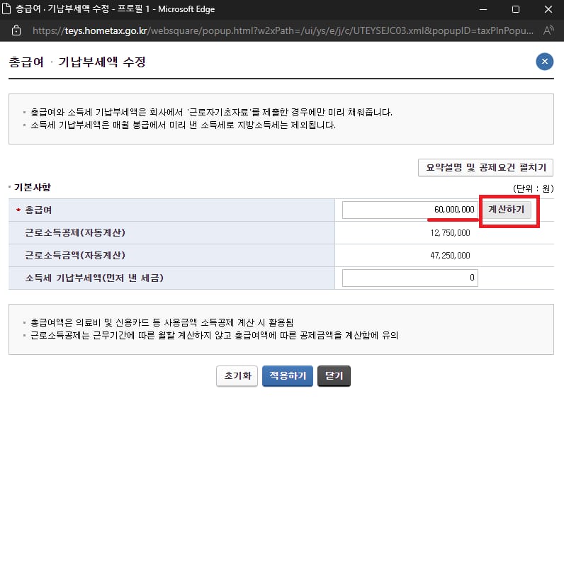 총급여 및 기납부세액 입력이 되었으면 적용하기를 눌러주세요.